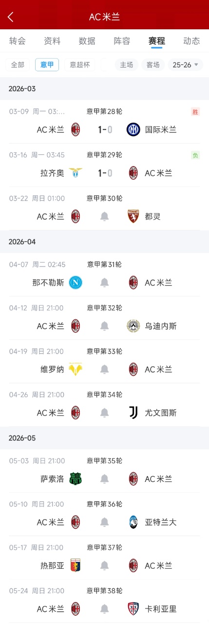 03月16日讯 意甲第29轮,AC米兰0-1不敌排名中游的拉齐奥。米兰在榜首国米战平丢分的情况下,自己输球反而让积分差距拉大1分。本赛季AC米兰对阵强队战绩很不错,他们上轮还刚刚完成对国米的双杀。但是红黑军团对阵中下游球队时往往丢分,是球队争冠最大的劣势。目前米兰距离榜首国米8分,他们剩余的9场比赛,将战那不勒斯尤文亚特兰大和中下游6队。米兰剩余赛程:主场v...